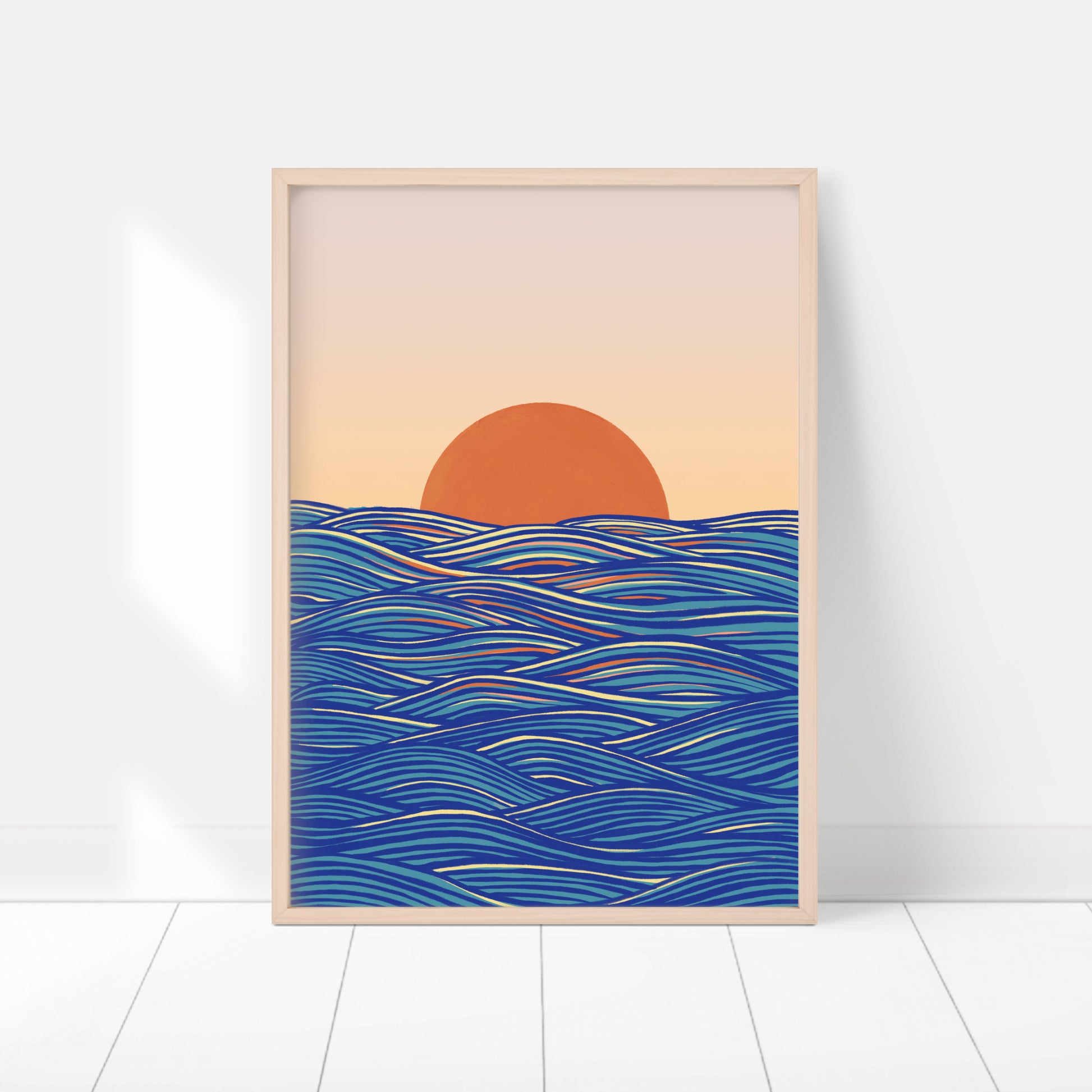 Modern art print of a gorgeous sunset over calm ocean waves.