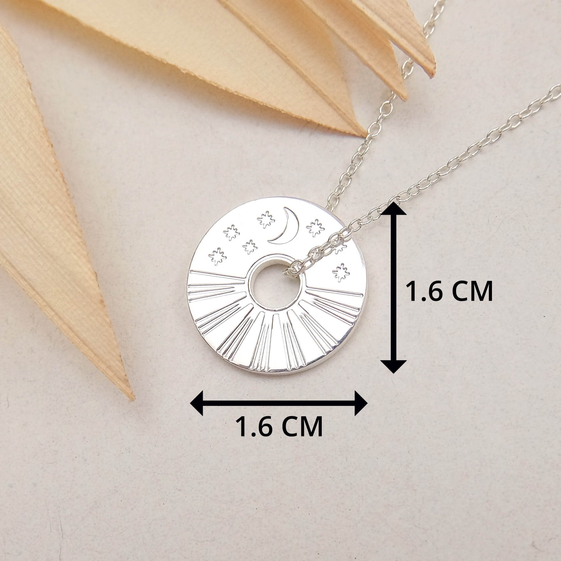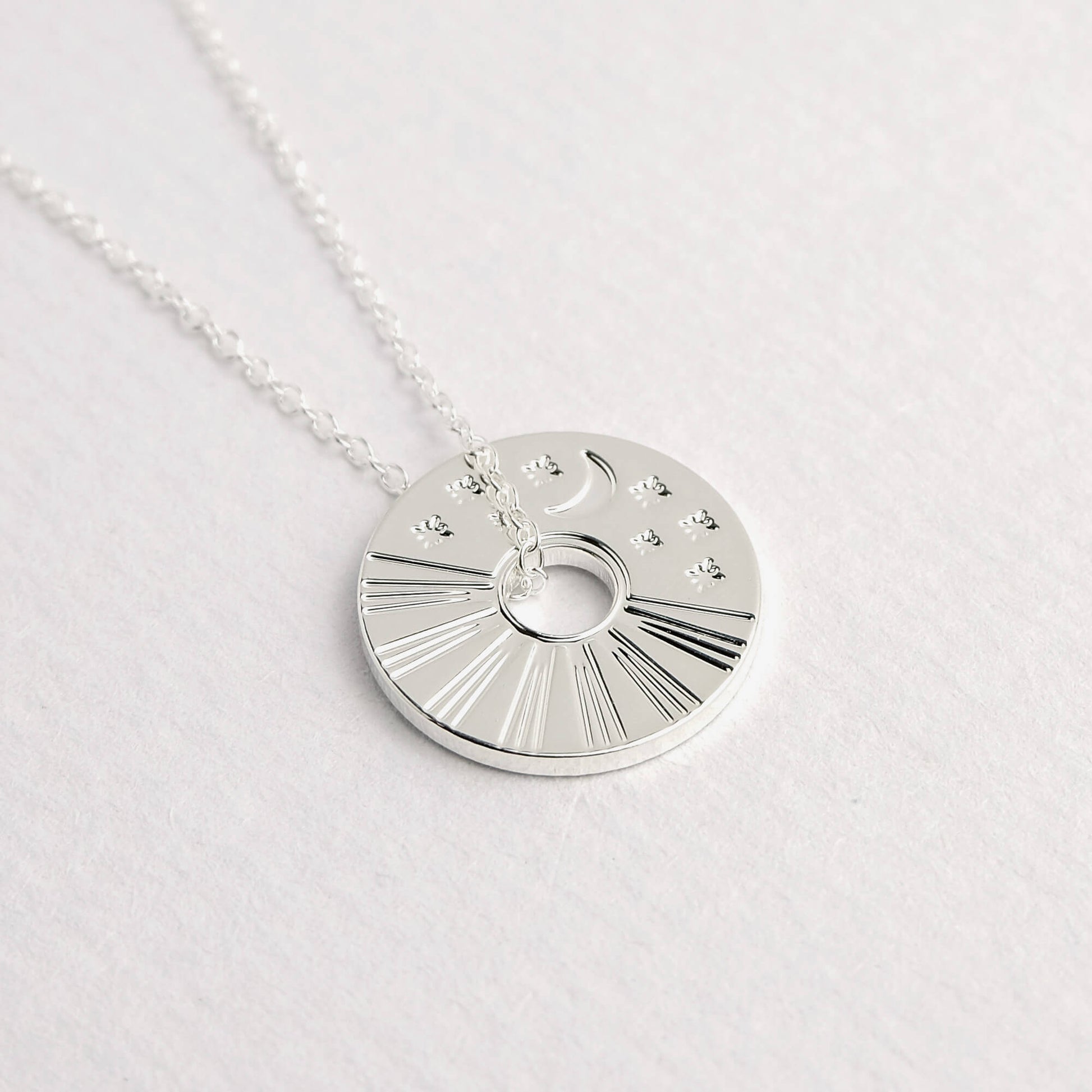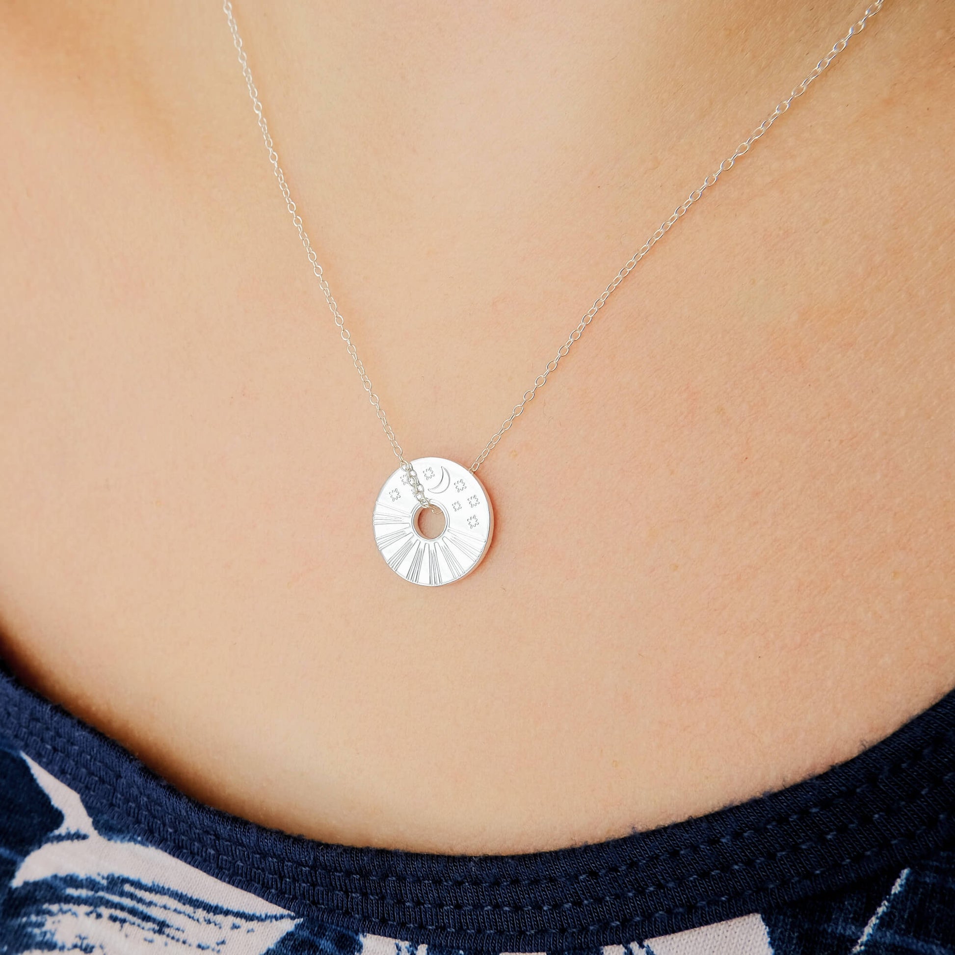 This unique necklace hangs freely on a dainty chain, spinning from day to night.