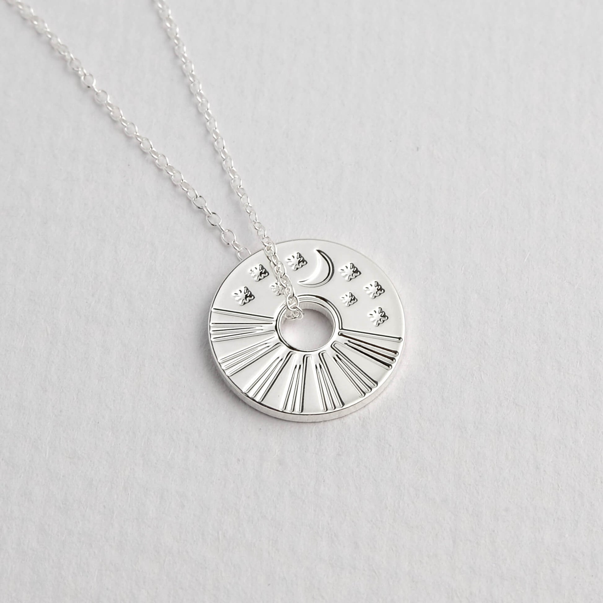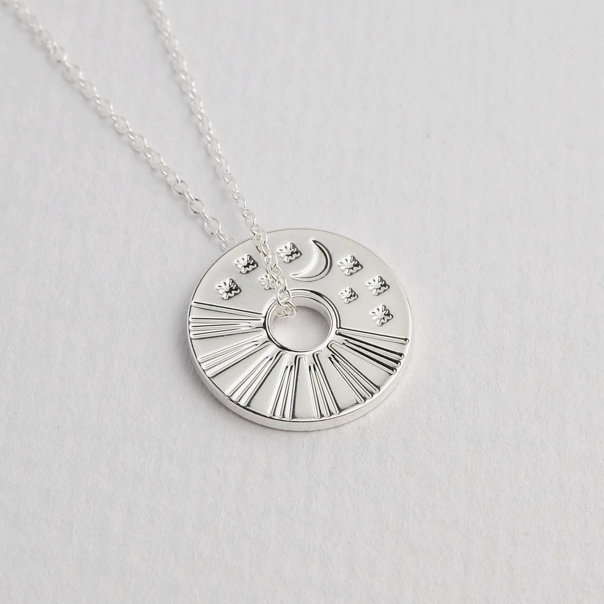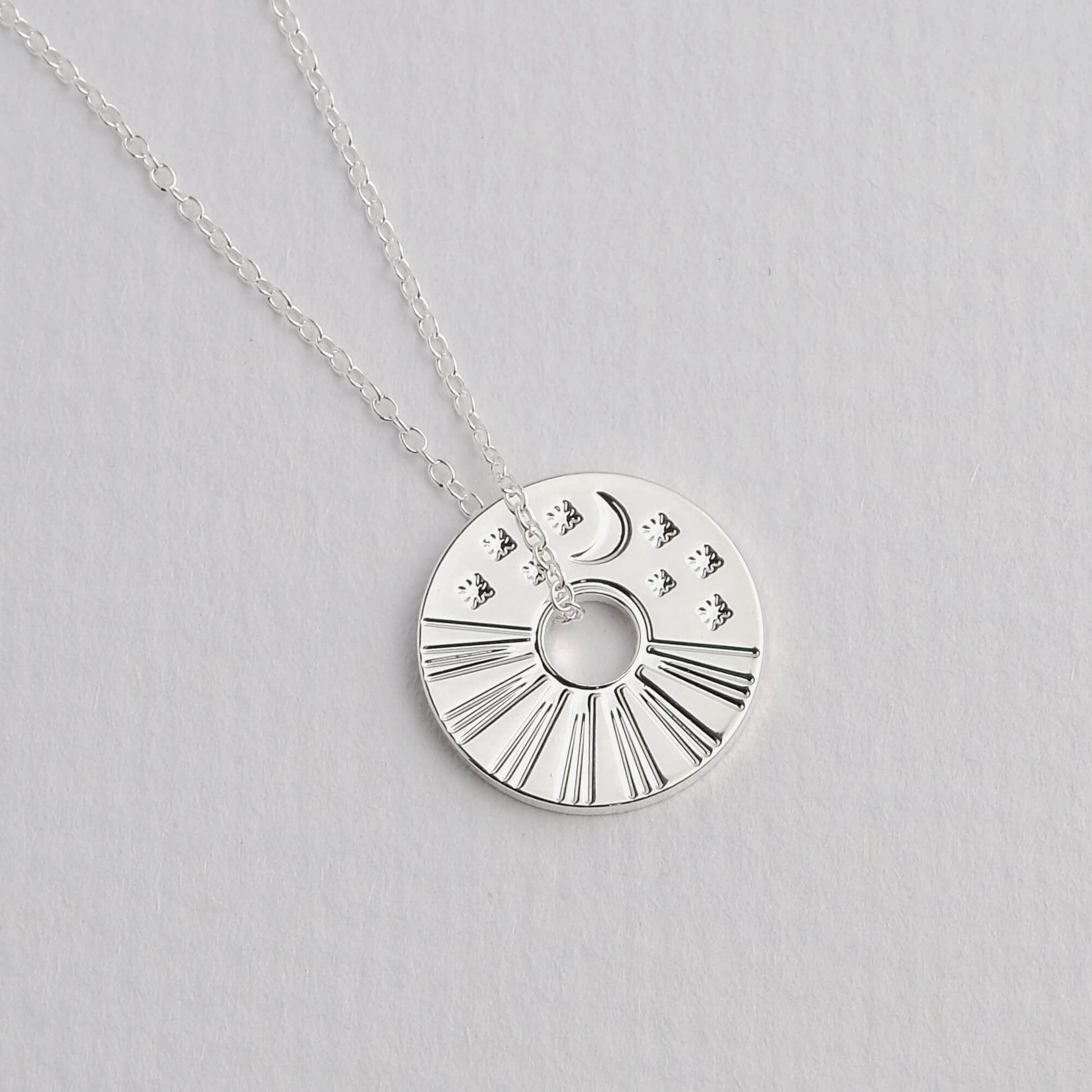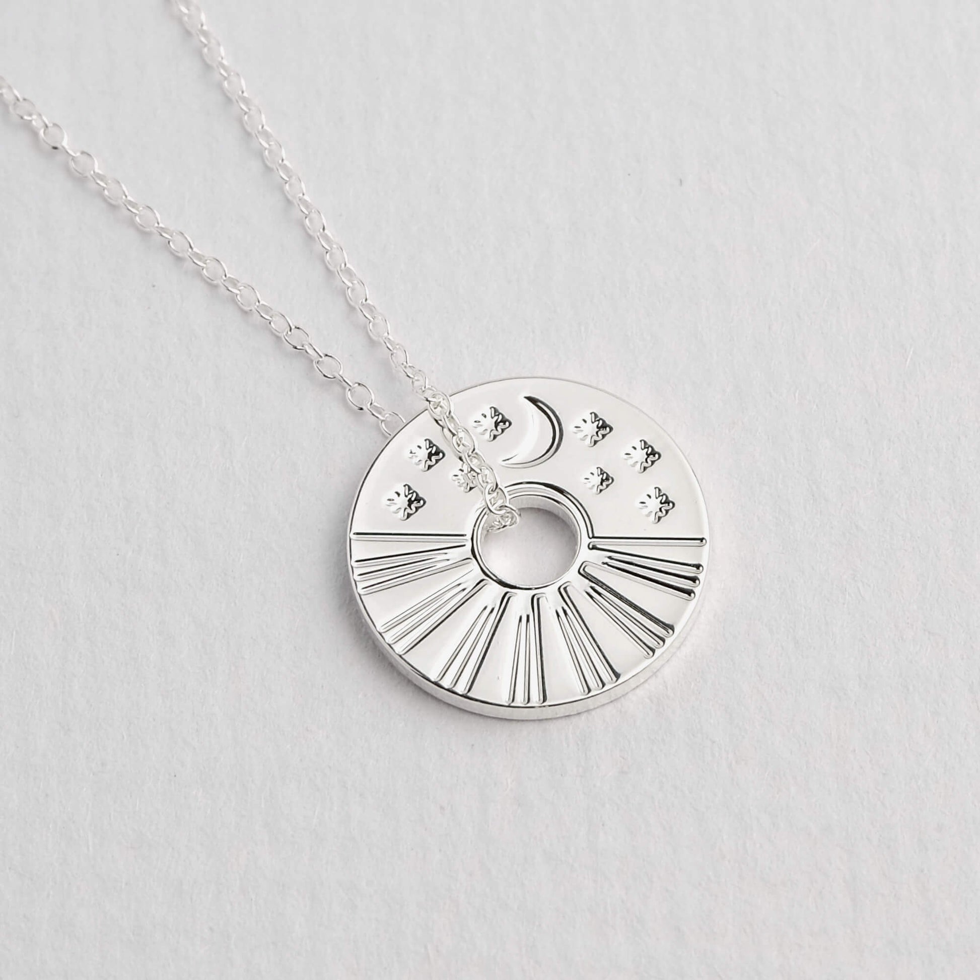 This unique necklace hangs freely on a dainty chain, spinning from day to night.