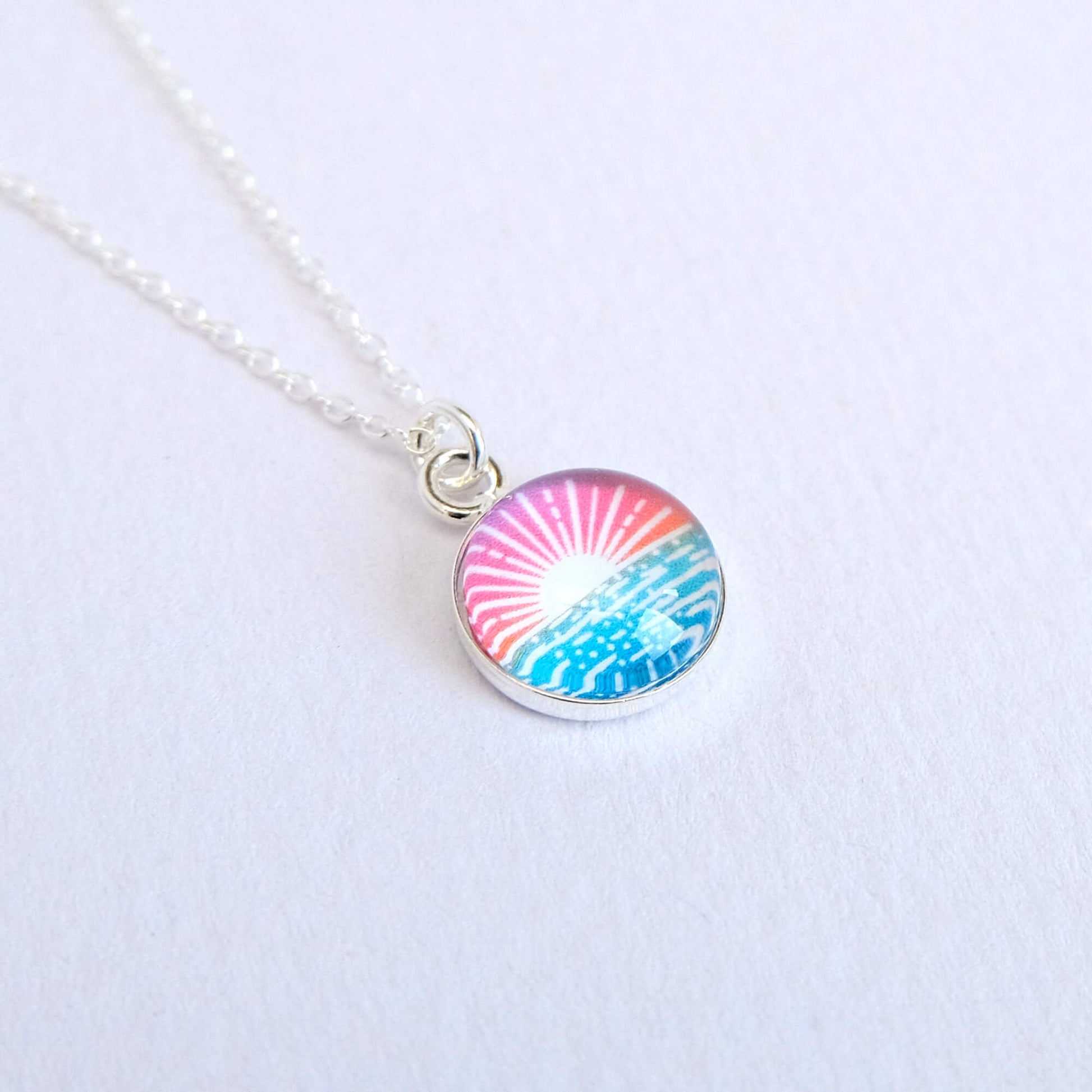 Perfect Day Sunrise Ocean Necklace featuring an original illustration of a beautiful sunrise over the sparkling water.