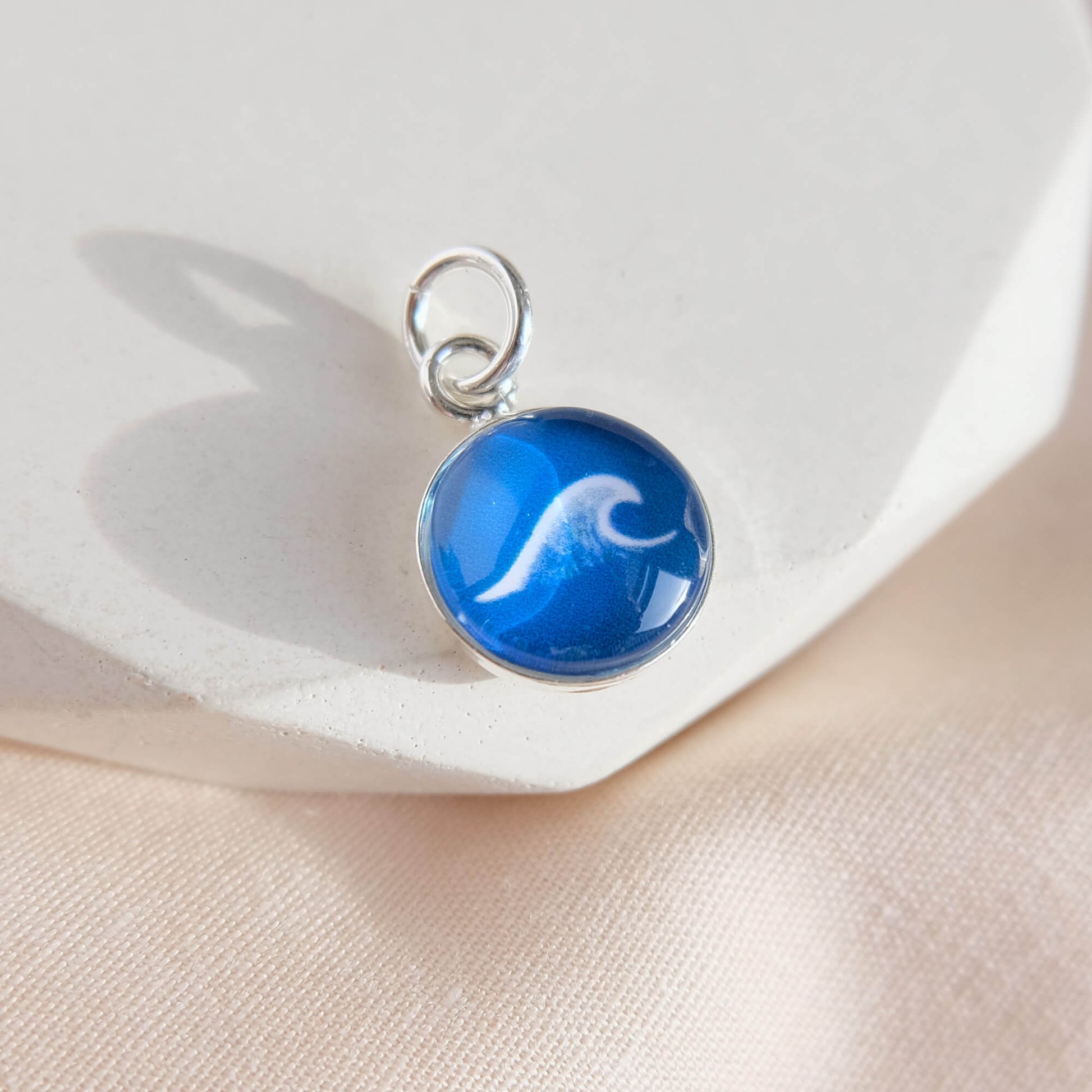 Deep Sea Blue Sterling Silver Wave Charm, the perfect gift for surfers and beach lovers alike.