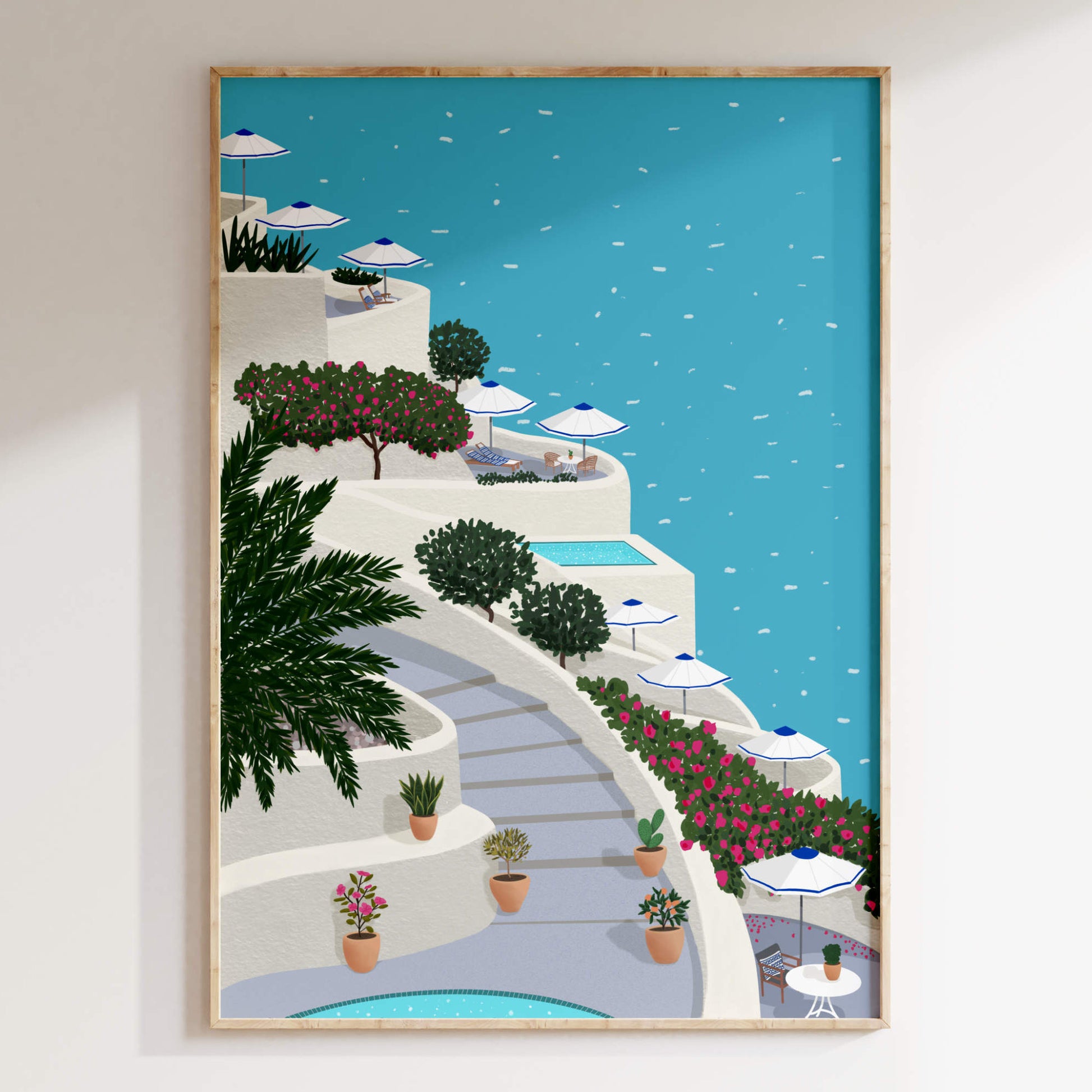 This is a print of an original artwork created by me (Cassie) in my Suffolk studio. I have included detailed elements such as the beautiful pink Bougainvillea flowers found all over Greece, a sparkling pool, and sun loungers with Greek inspired patterns on the tiny cushions.