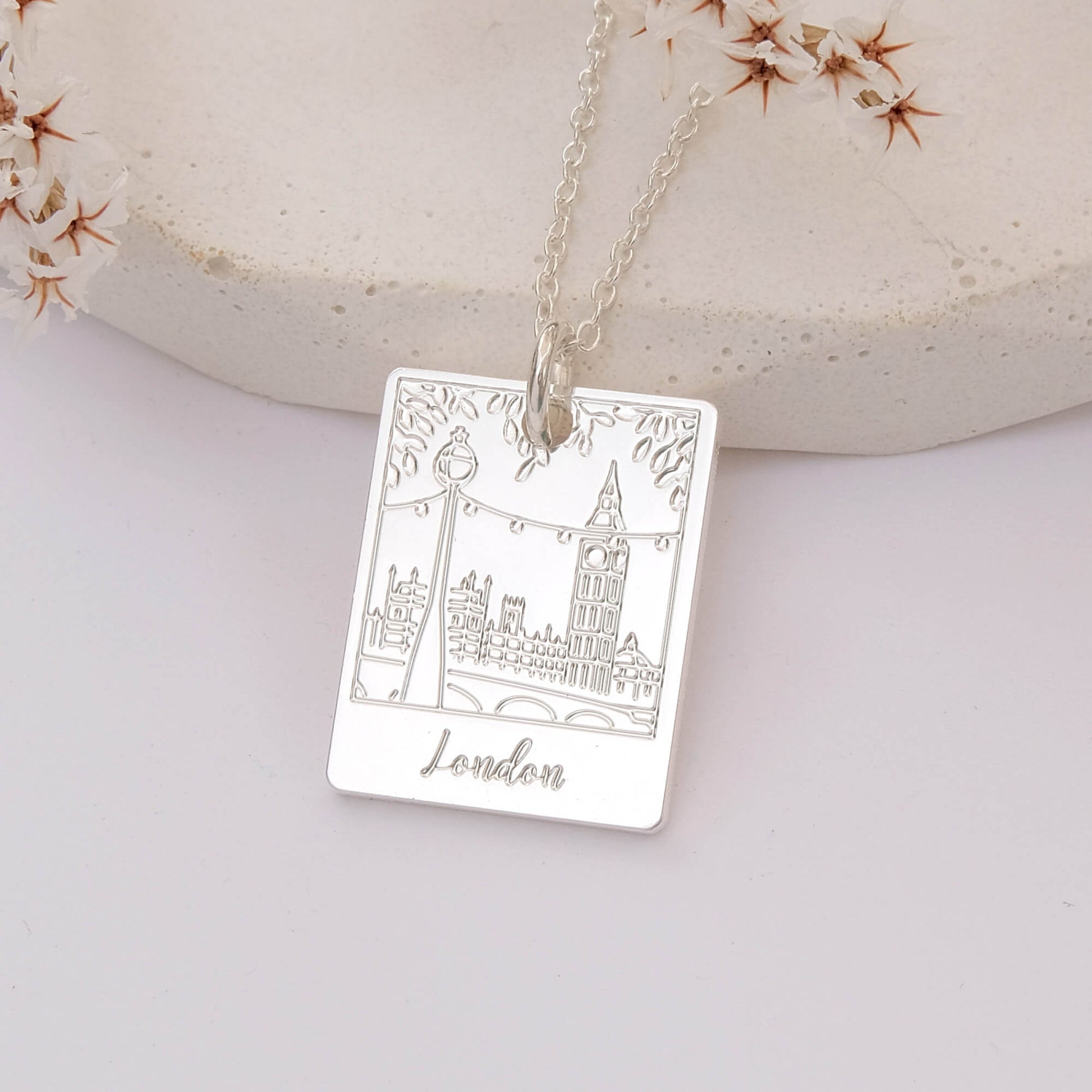 The pendant is in the style of an instant photo complete with the word London in a hand-written font, along with details such as a classic London lamp post and glittering fairy lights.