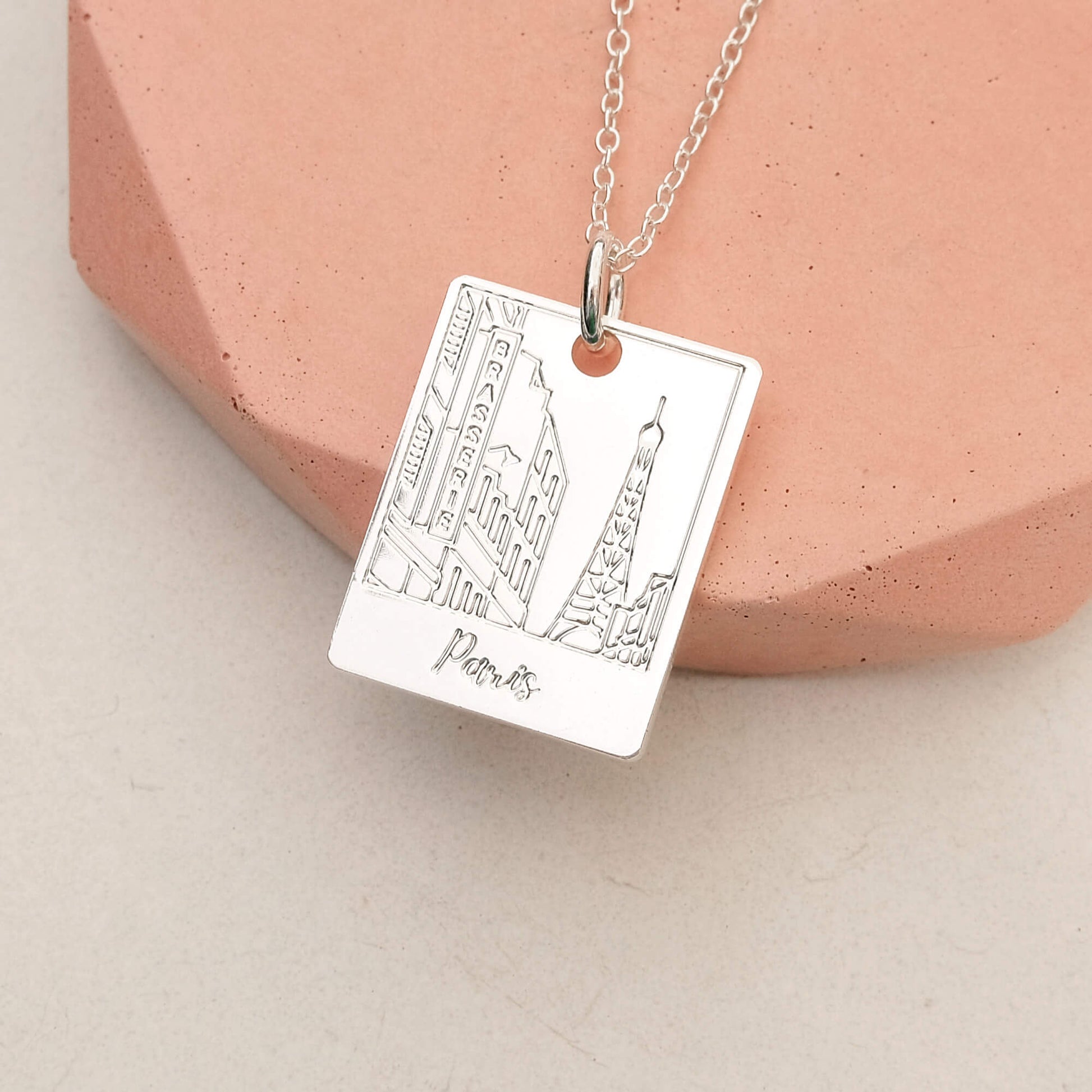 The pendant is in the style of an instant photo complete with the word Paris in a hand-written font, along with details such as a sign that says "Brasserie".