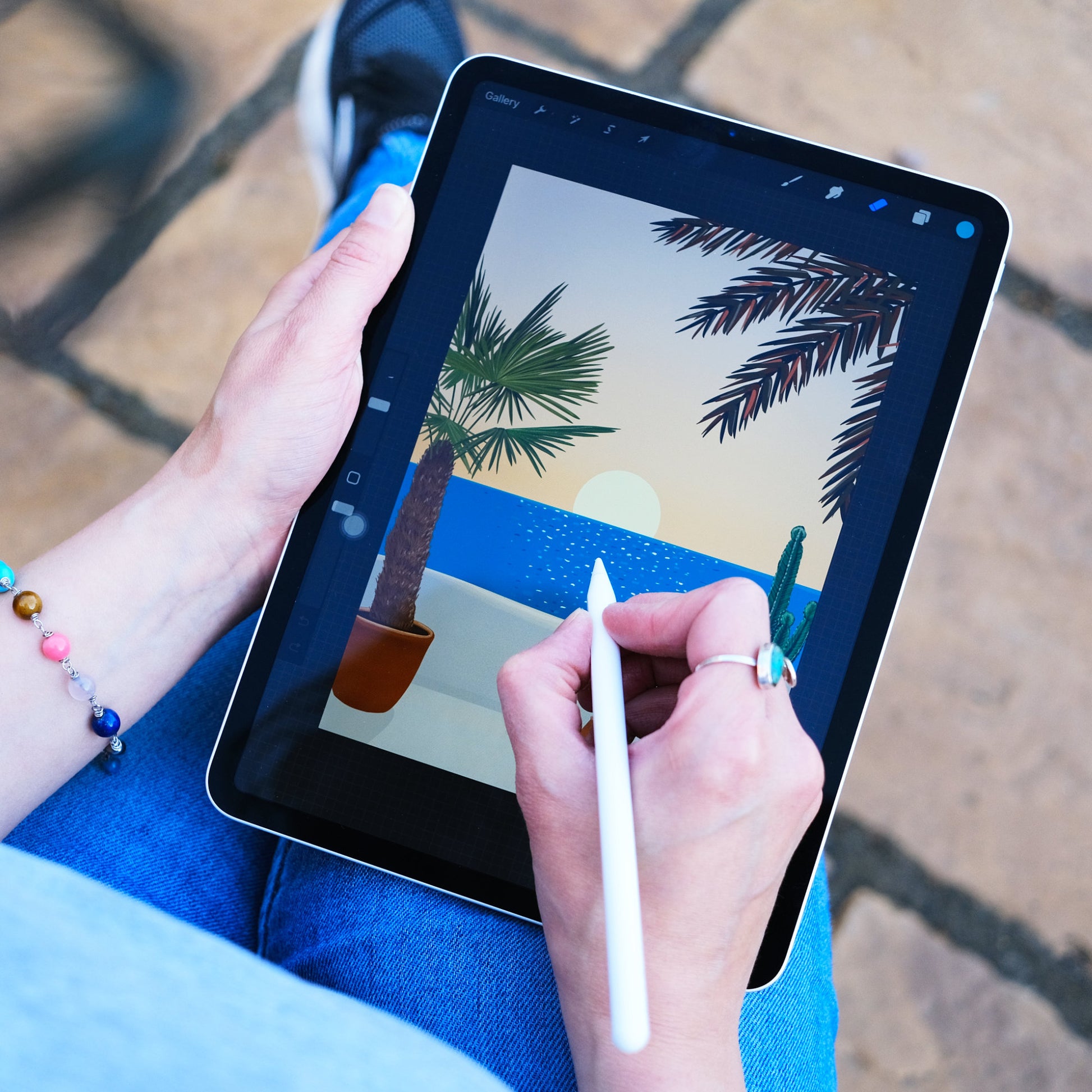 Original wall art illustration of breakfast Coffee with traditional Portuguese Pastel de Nata (custard tart) pastries lightly dusted with cinnamon. I illustrated the coffee and pastries on blue and white Portuguese patterned plates and included the shadow of a palm tree to add to the morning holiday atmosphere.