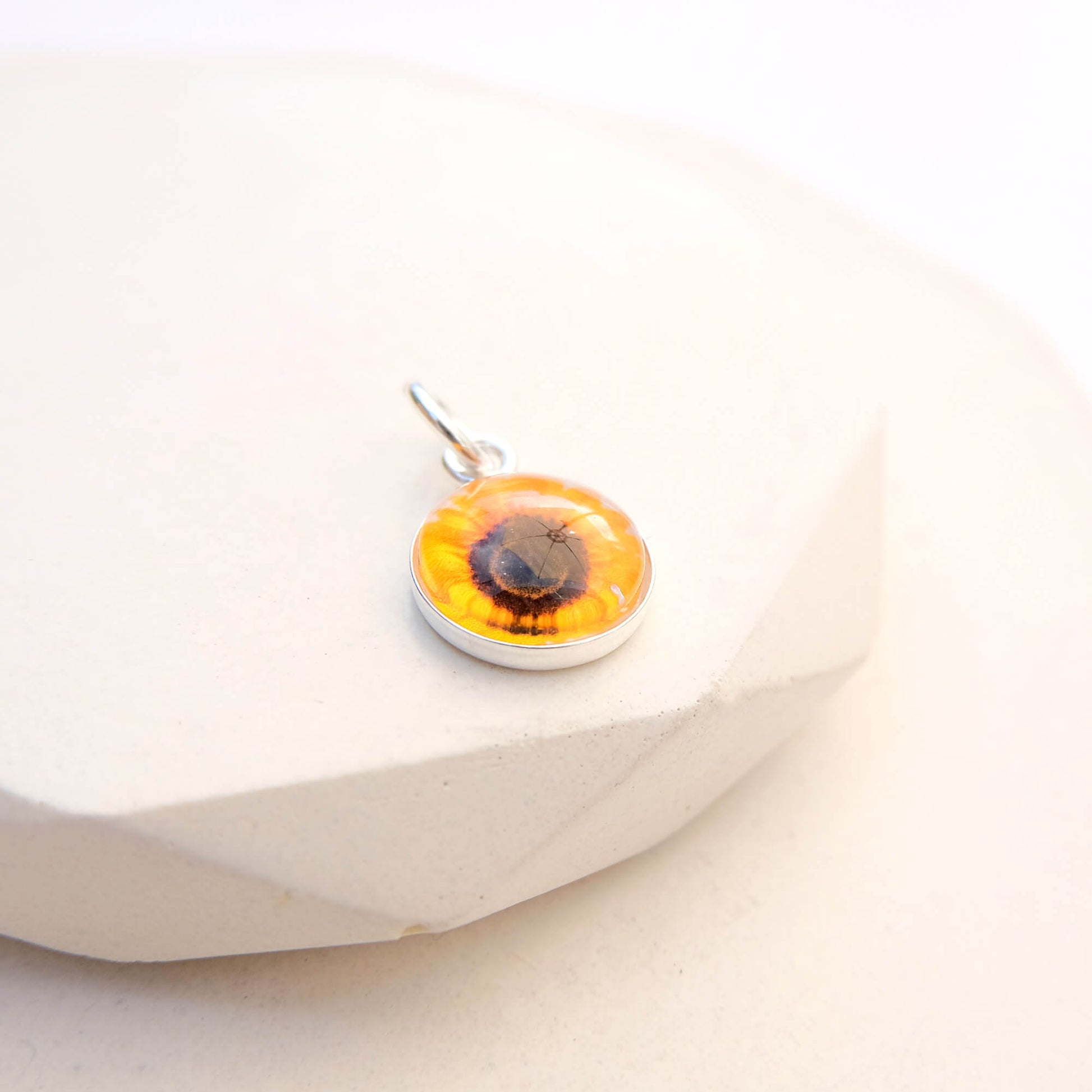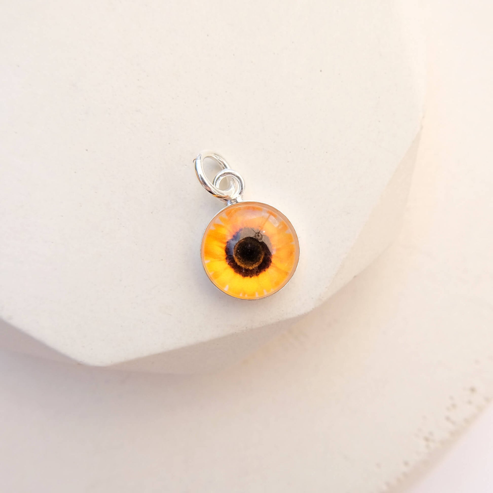 Dainty Sterling Silver Sunflower Charm featuring a tiny photography print of a gorgeous Sunflower.