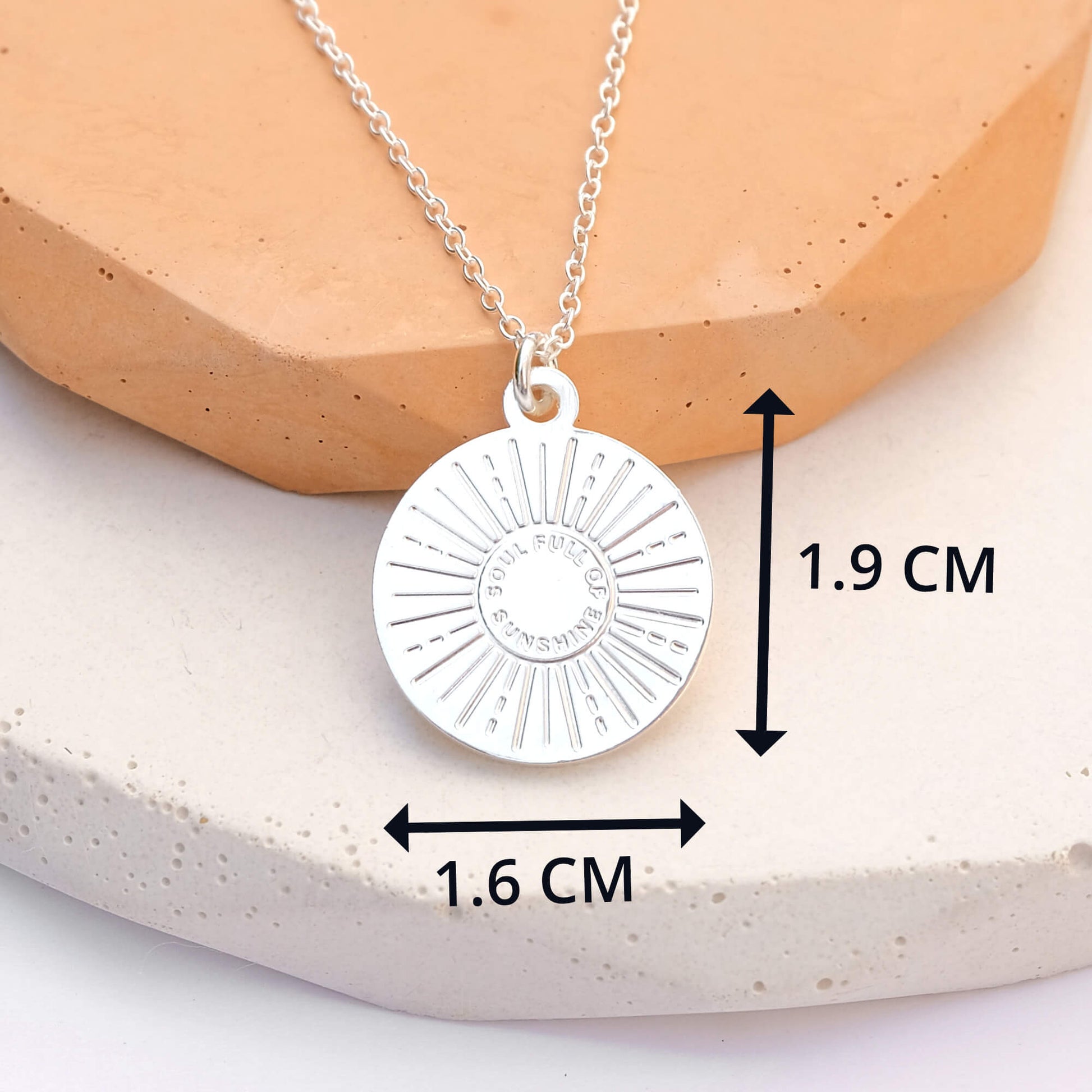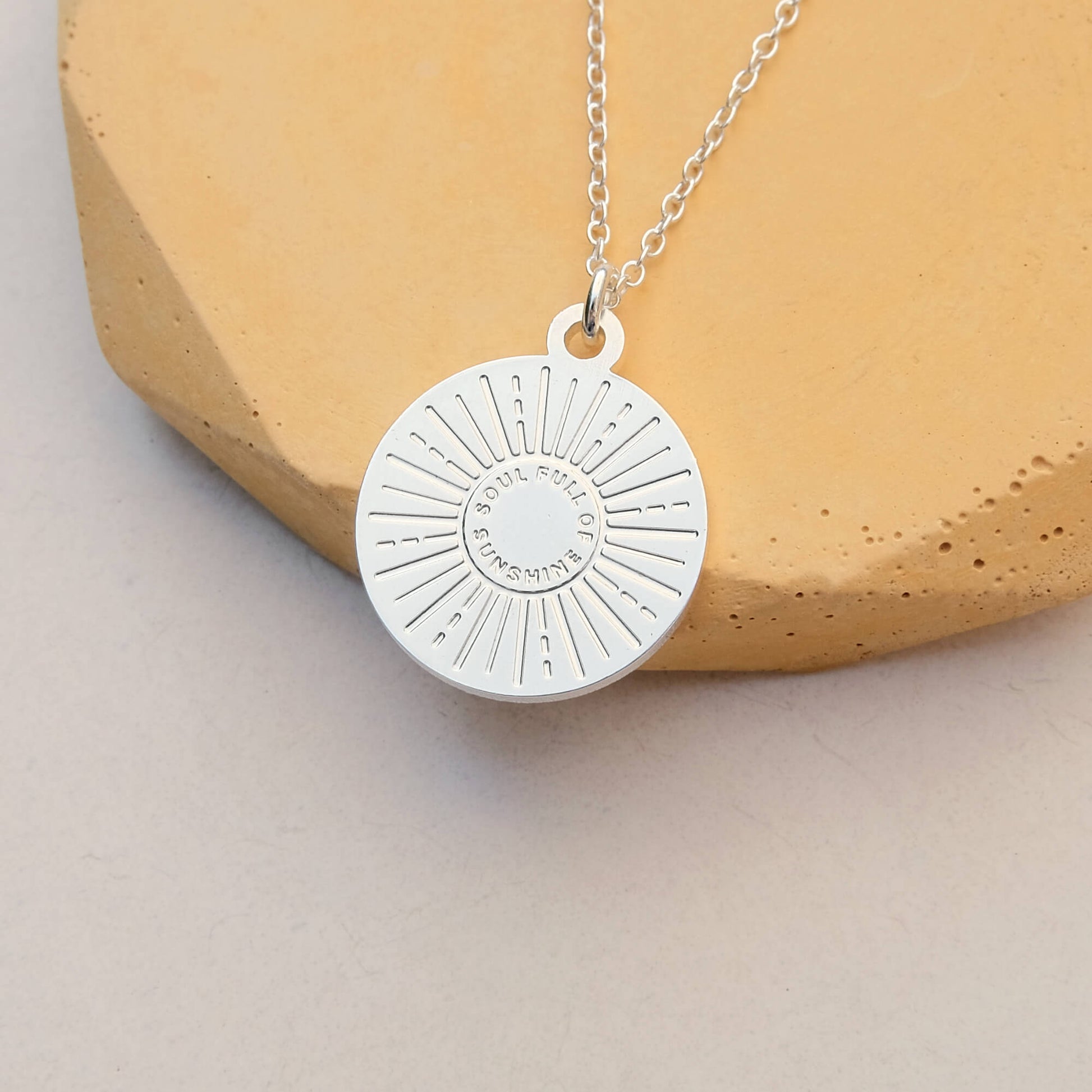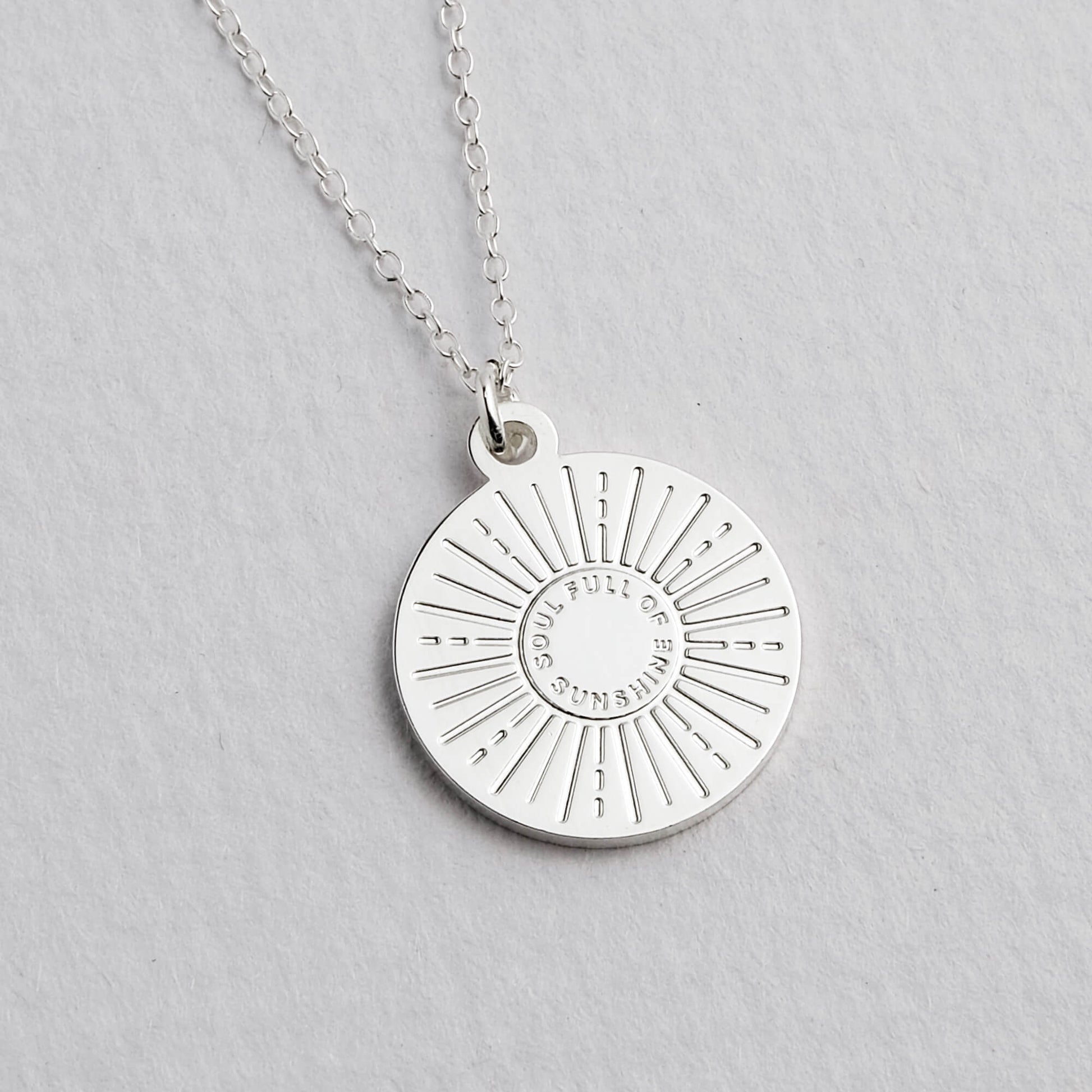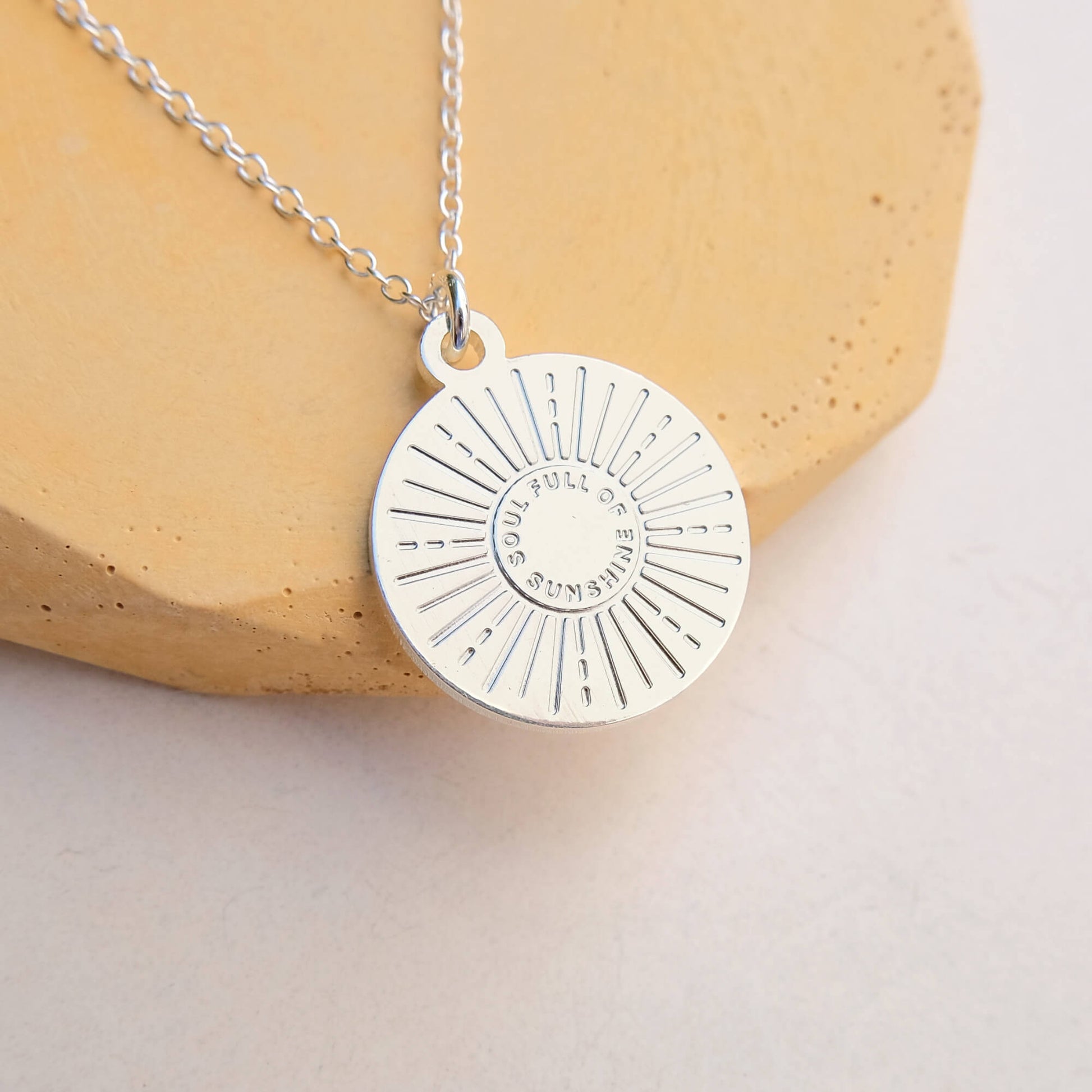 Sun Necklace with a light catching sunburst design that includes the quote "Soul full of Sunshine".